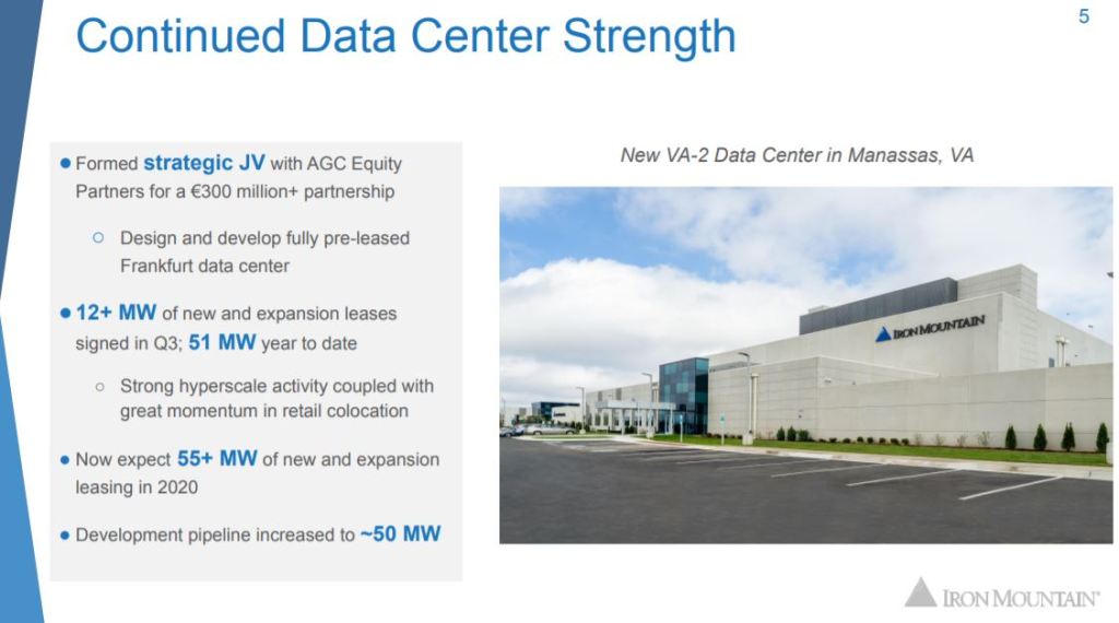 Es wird das neue Daten-Center in Frankfurt bepriesen, welches bereits voll vermietet ist und somit eine neue sichere Einnahmequelle darstellt. Das Risiko liegt allerdings wieder in den hohen Investitionskosten, welches Iron Mountain für die Neuaquise in die Hand nehmen muss.