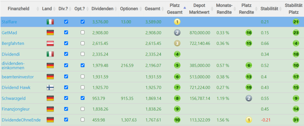 - Persönlich freue mich noch immer über die Mai-Dividenden, dir mir persönlich einen riesen Rekord eingebracht haben. Mit insgesamt 1.838,26 Euro an Dividenden, habe ich es geschafft, einen Durchschnittslohn in Deutschland komplett passiv zu erzielen. Darauf bin ich schon echt stolz und zeigt die Leistung auch im Aktiefinder von Torsten mit Platz 9 für den Monat: