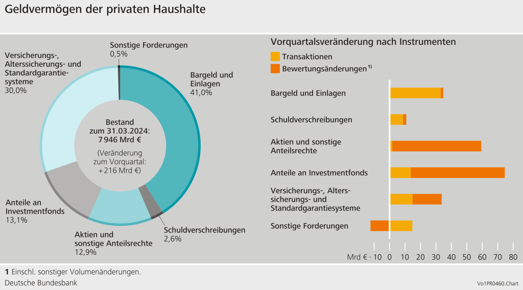 Die Veröffentlichung der deutschen Bundesbank zeigt, dass mehr als 40% als Bargeld und Einlagen auf Girokonten liegen. Weitere 30% irgendwo im Versicherungssystem und nur ein kleiner Teil von jeweils 13% in Aktien oder Investmentfonds. In den Assetklassen, in denen eine Rendite winkt.